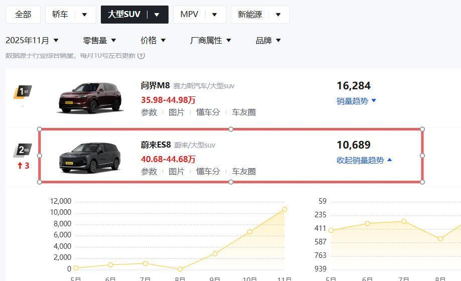 在这一背景下,大三排SUV细分市场迎来重要拐点。蔚来全新ES8作为纯电大三排SUV的代表作之一,凭借900V架构和大空间以及便捷的充换电补能体系,获得了广泛认可,该车在9月下旬正式上市,11月份单月交付量已经超过10000台,与同级别增程产品形成分庭抗礼之势。