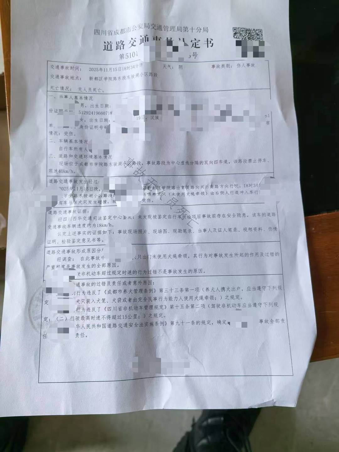 此前在成都新都区因骑车被未拴绳宠物狗绊倒女子的健康状况,备受社会关注。12月2日,受伤女子的姐姐程女士(化名)告诉记者,妹妹小涵(化名)在上周六已经出院,手术很顺利,目前正在家中恢复。此外,交警出具了事故责任认定书,认定狗主人任某某携带犬只出门未拴绳,承担事故的全部责任。