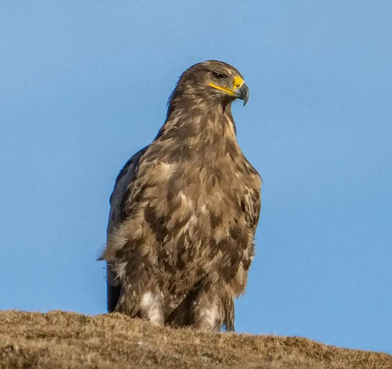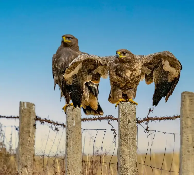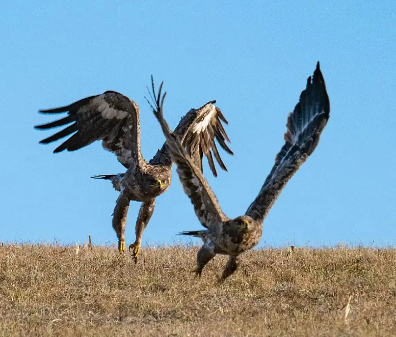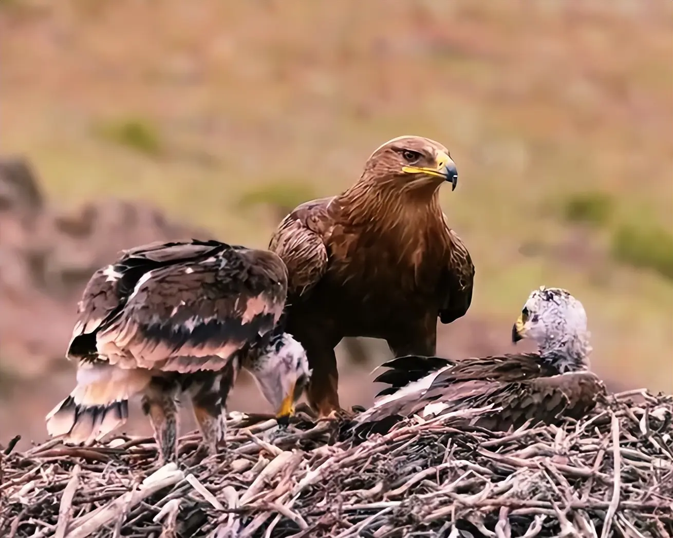 每年4到6月是草原雕的繁殖期,它们会在悬崖峭壁、山顶岩石堆、地面土堆甚至干草堆上筑巢,建好巢后会繁殖产卵。