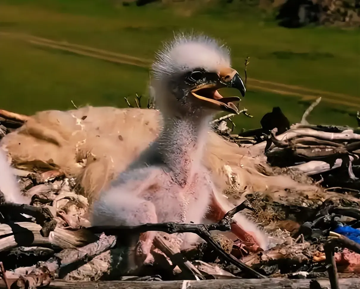 刚出世的雏雕浑身光秃秃的,完全依赖父母喂养,要经过将近两个月的成长才能离巢试飞。
