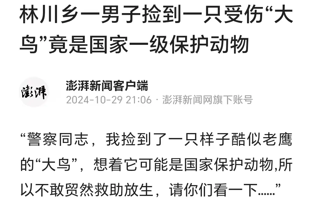 信息来源:澎湃新闻客户端2024年10月29日《林川乡一男子捡到一只受伤“大鸟”竟是国家一级保护动物》高忆管理