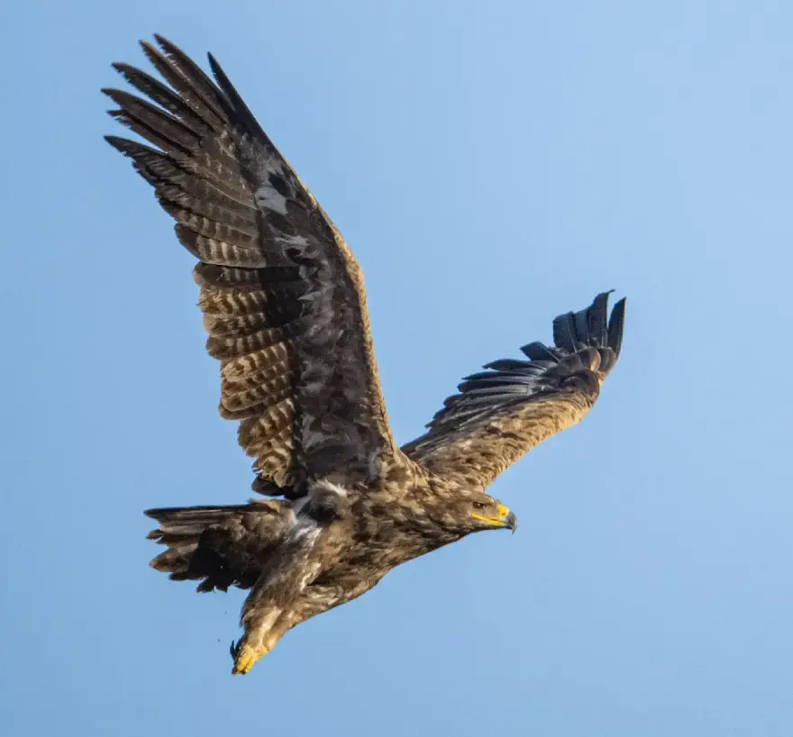 这可不是什么大鸟,它的名字叫草原雕,作为鹰科雕属的大型猛禽,雌雕能长到81厘米,翼展能破2米,体重将近3公斤。