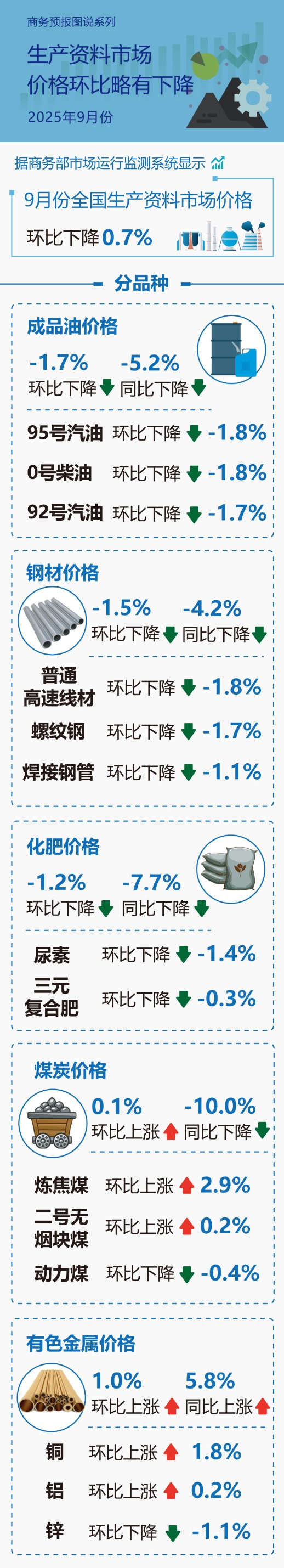 从主要品种来看,成品油价格环比下降1.7%,同比下降5.2%,其中,95号汽油、0号柴油、92号汽油环比分别下降1.8%、1.8%和1.7%。钢材价格环比下降1.5%,同比下降4.2%,其中,普通高速线材、螺纹钢、焊接钢管环比分别下降1.8%、1.7%和1.1%。化肥价格环比下降1.2%,同比下降7.7%,其中,尿素、三元复合肥环比分别下降1.4%和0.3%,煤炭价格环比上涨0.1%,同比下降10.0%,其中,炼焦煤、二号无烟块煤环比分别上涨2.9%和0.2%,动力煤价格环比下降0.4%。有色金属价格环比上涨1.0%,同比上涨5.8%,其中,铜、铝环比分别上涨1.8%和0.2%,锌价环比下降1.1%。